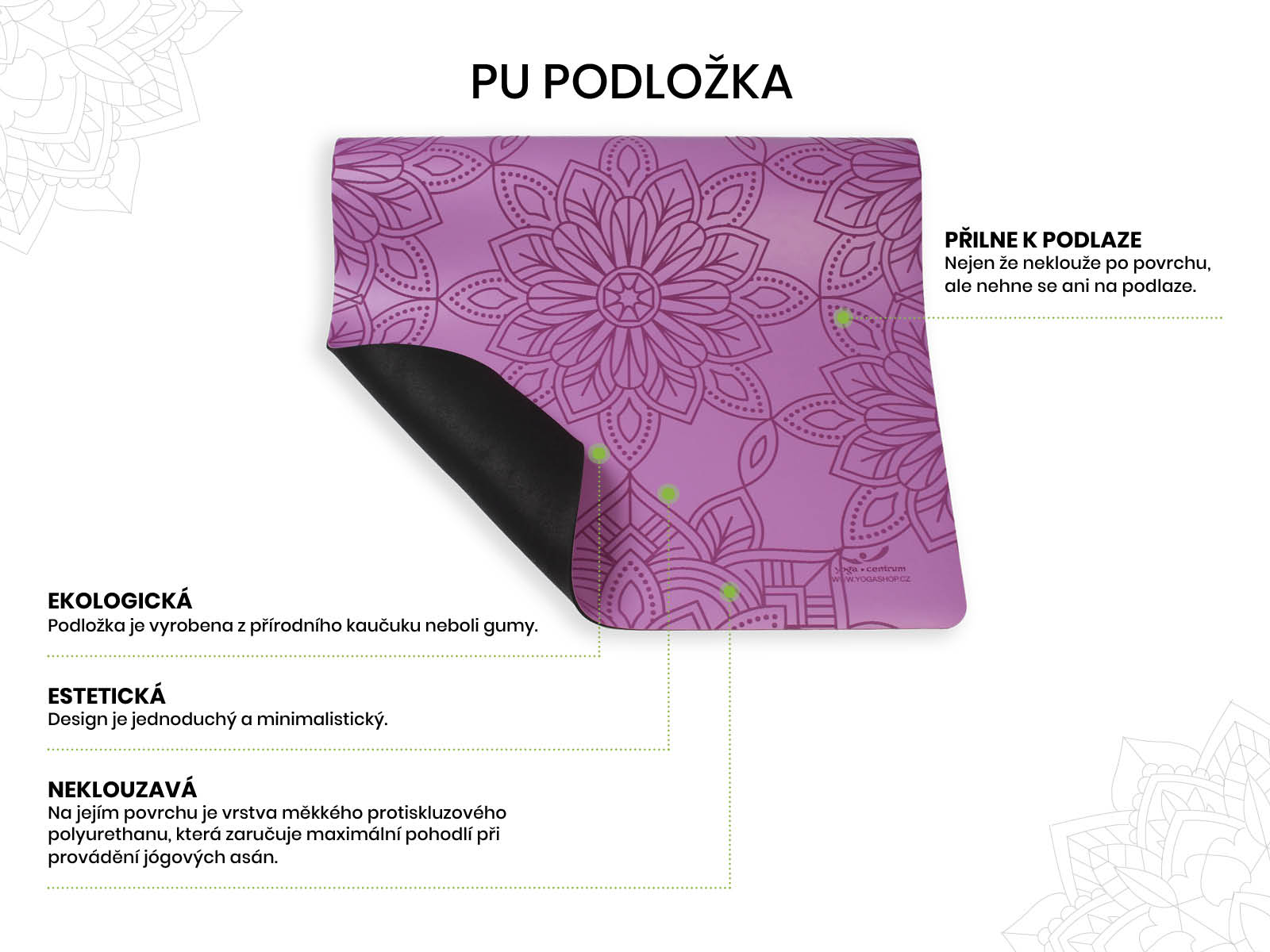 Yogacentrum PU podložky na jógu jsou vyrobená z přírodního kaučuku a díky tomu perfektně přilne k podlaze. Na jejím povrchu je vrstva měkkého protiskluzového polyurethanu, která zaručuje maximální pohodlí při provádění jógových asán.